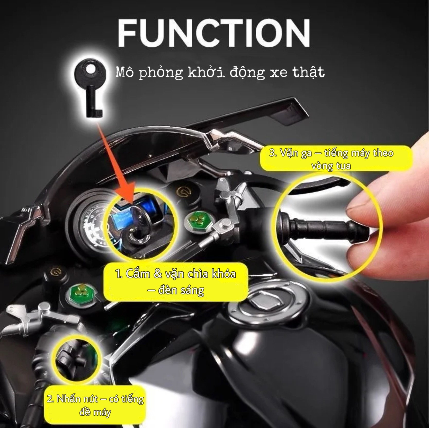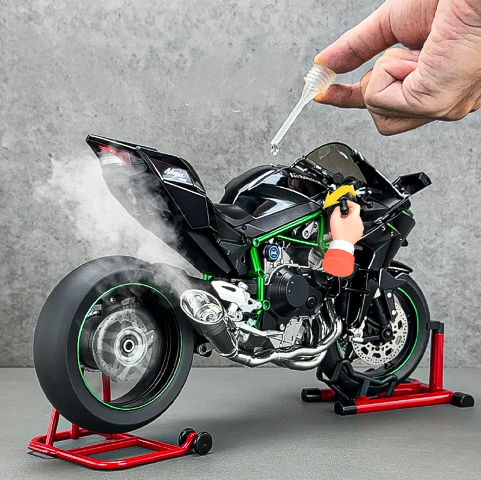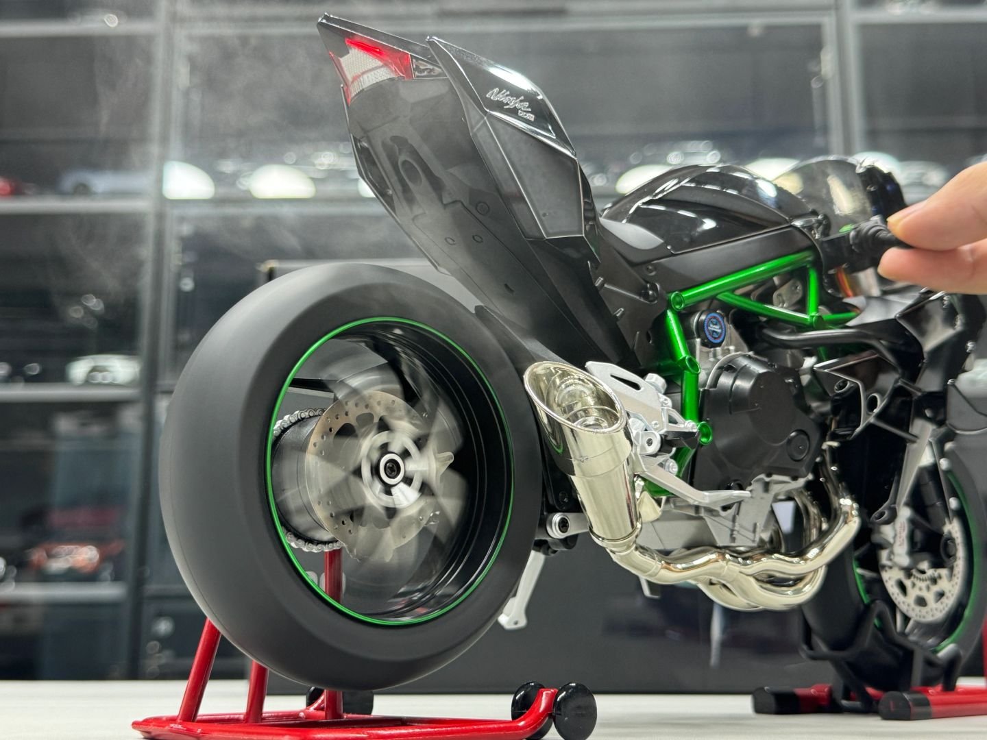Kawasaki Ninja H2R 1:6 ไม่ใช่แค่โมเดลแบบคงที่ แต่ยังมาพร้อมฟีเจอร์ทันสมัยเพื่อประสบการณ์ไดนามิก โมเดลนี้ได้รับการออกแบบอย่างพิถีพิถันด้วยรายละเอียดที่คมชัดและสมจริง ซึ่งรวมถึง: