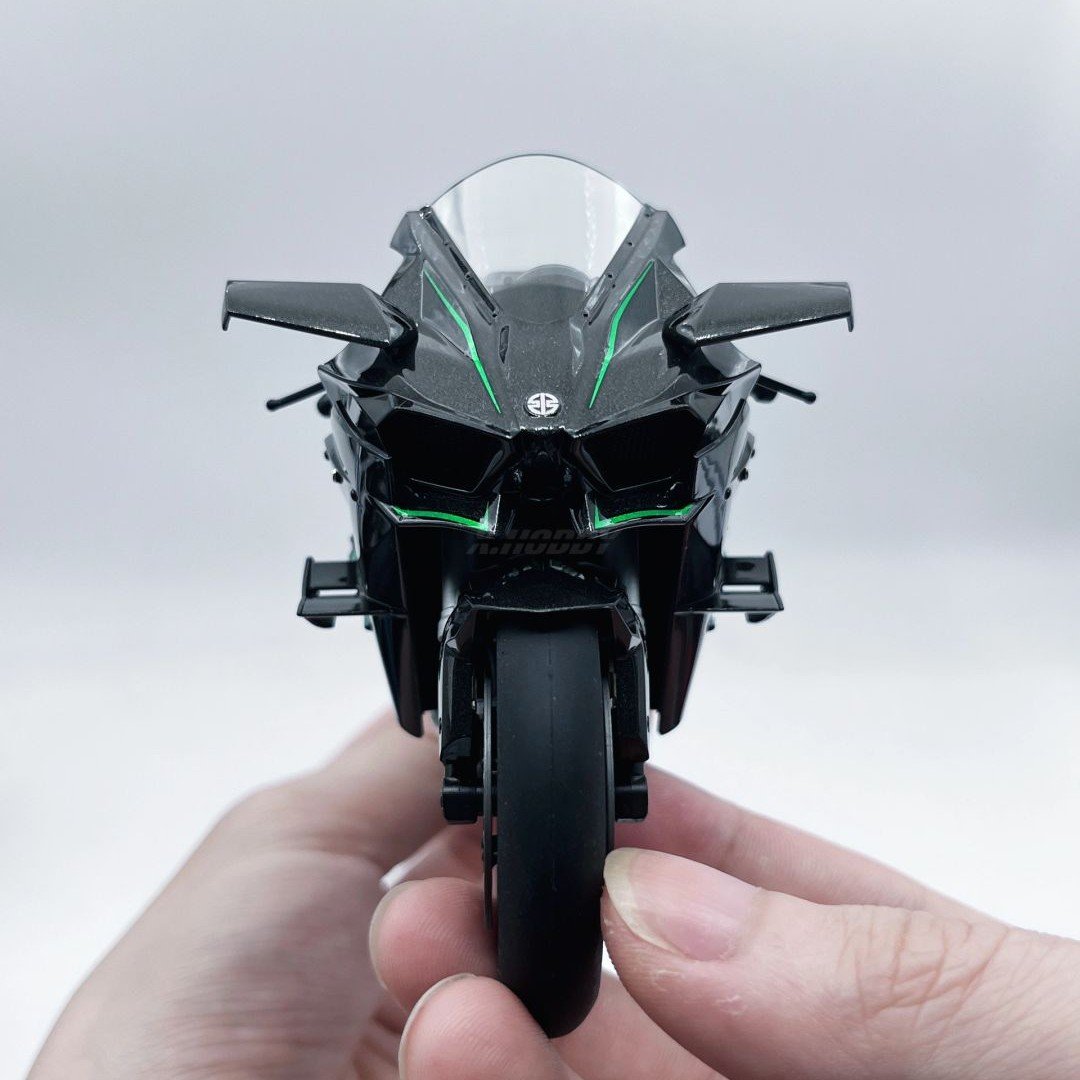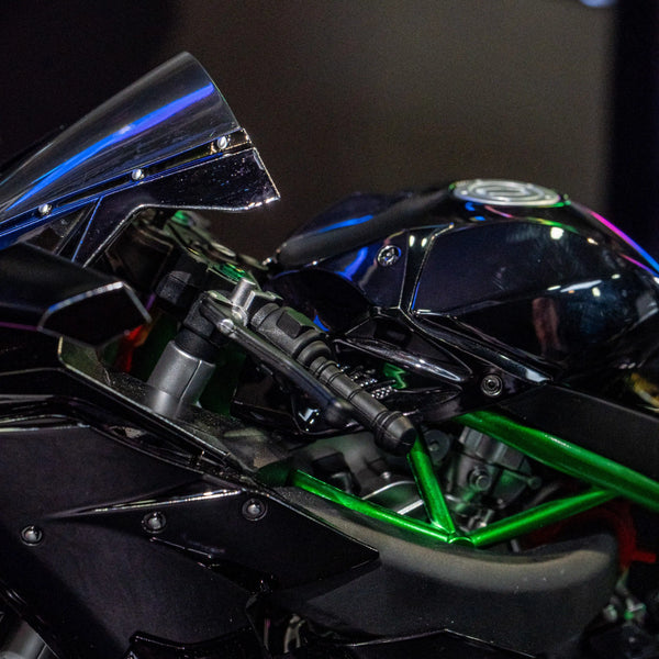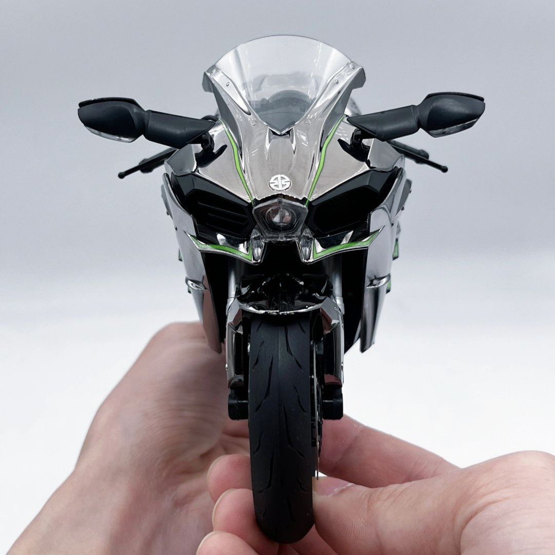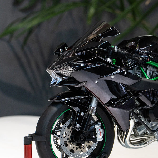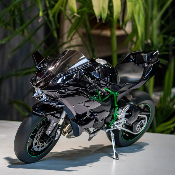 โมเดล Kawasaki Ninja H2R ขนาด 1:6 ผลิตอย่างพิถีพิถัน เลียนแบบรถมอเตอร์ไซค์คาวาซากิในตำนานได้อย่างสมบูรณ์แบบ ด้วยขนาด ความยาว 33 ซม. กว้าง 13 ซม. และสูง 17 ซม. จึงให้ความรู้สึกสมจริงราวกับรถมอเตอร์ไซค์ขนาดเล็กลง