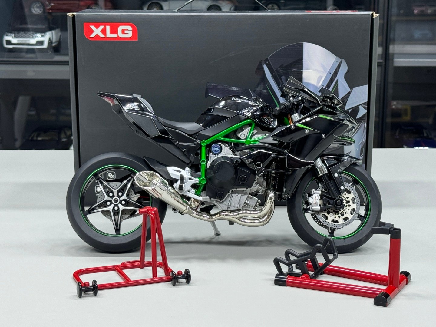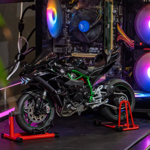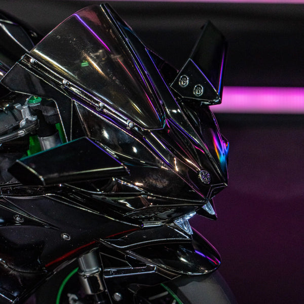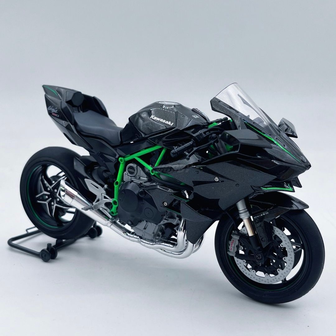 โมเดล Kawasaki Ninja H2R ขนาด 1:6 ผลิตอย่างพิถีพิถัน เลียนแบบรถมอเตอร์ไซค์คาวาซากิในตำนานได้อย่างสมบูรณ์แบบ ด้วยขนาด ความยาว 33 ซม. กว้าง 13 ซม. และสูง 17 ซม. จึงให้ความรู้สึกสมจริงราวกับรถมอเตอร์ไซค์ขนาดเล็กลง
